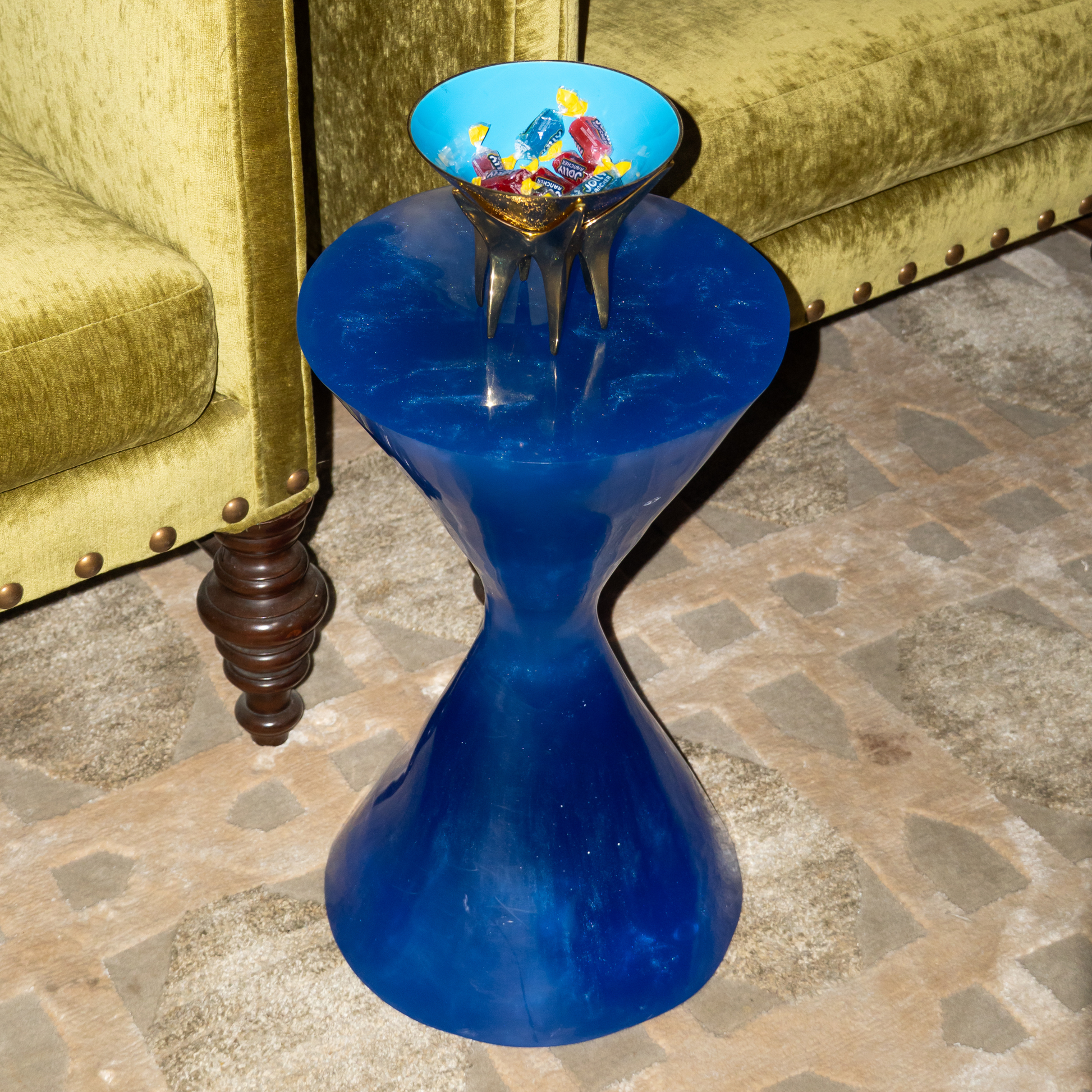 Diseño escultórico y funcional en una sola pieza. Esta mesa auxiliar de resina en tono azul es ideal para complementar salas, terrazas o recámaras. Su silueta en reloj de arena aporta un toque moderno y artístico, mientras que su ligereza lo hace fácil de mover y adaptar a cualquier espacio.